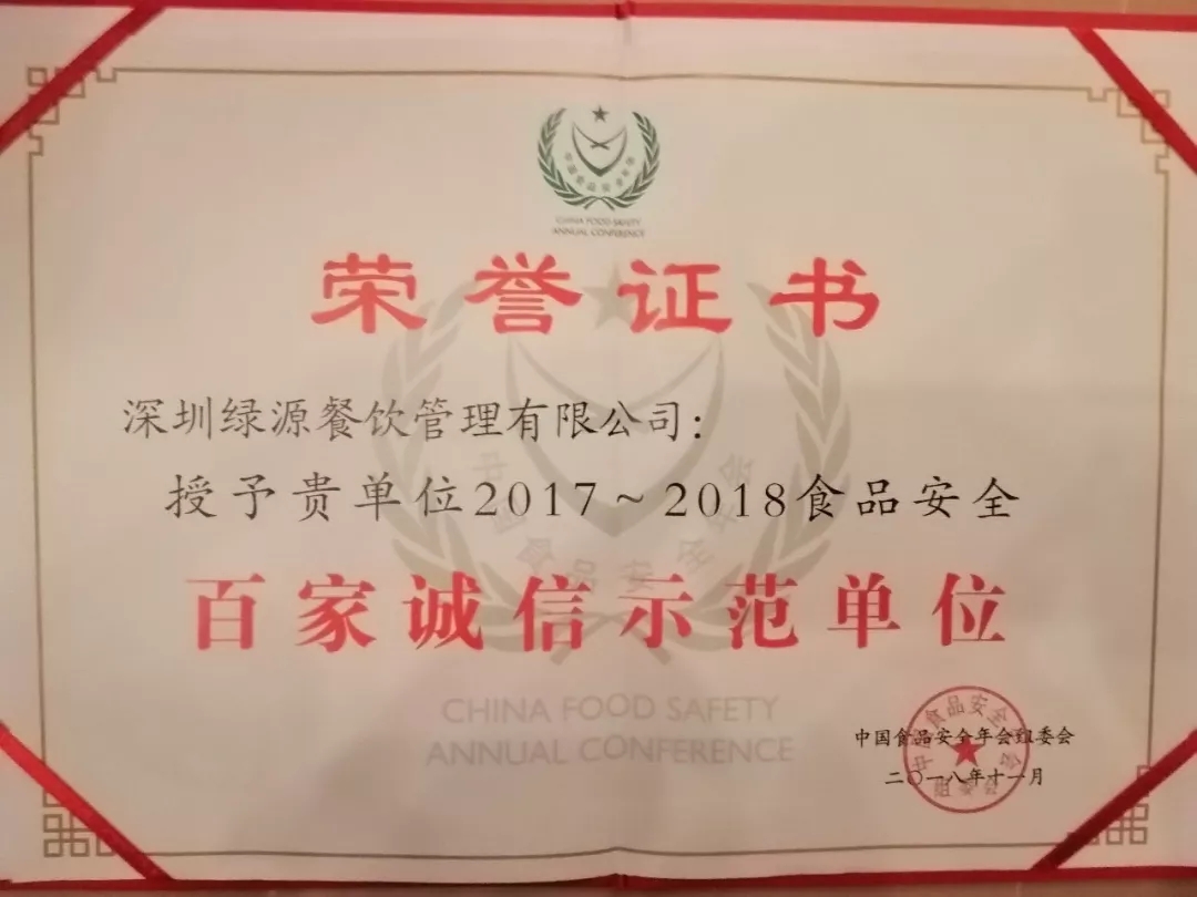 △核電品質(zhì),堅(jiān)守安全。綠源餐飲連續(xù)三年(2016、2017、2018)榮獲“全國(guó)百家誠(chéng)信示范單位”這一殊榮。