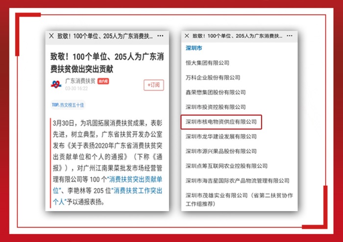3月30日,為鞏固拓展消費扶貧成果,表彰先進,樹立典型,廣東省扶貧開發辦公室發布《關于表揚2020年廣東省消費扶貧突出貢獻單位和個人的通報》,對100個“消費扶貧突出貢獻單位”、205位“消費扶貧工作突出個人”予以通報表揚。中廣核服務集團下屬深圳市核電物資供應有限公司(簡稱“物資公司”)榮獲“廣東省2020年消費扶貧突出貢獻單位”稱號。