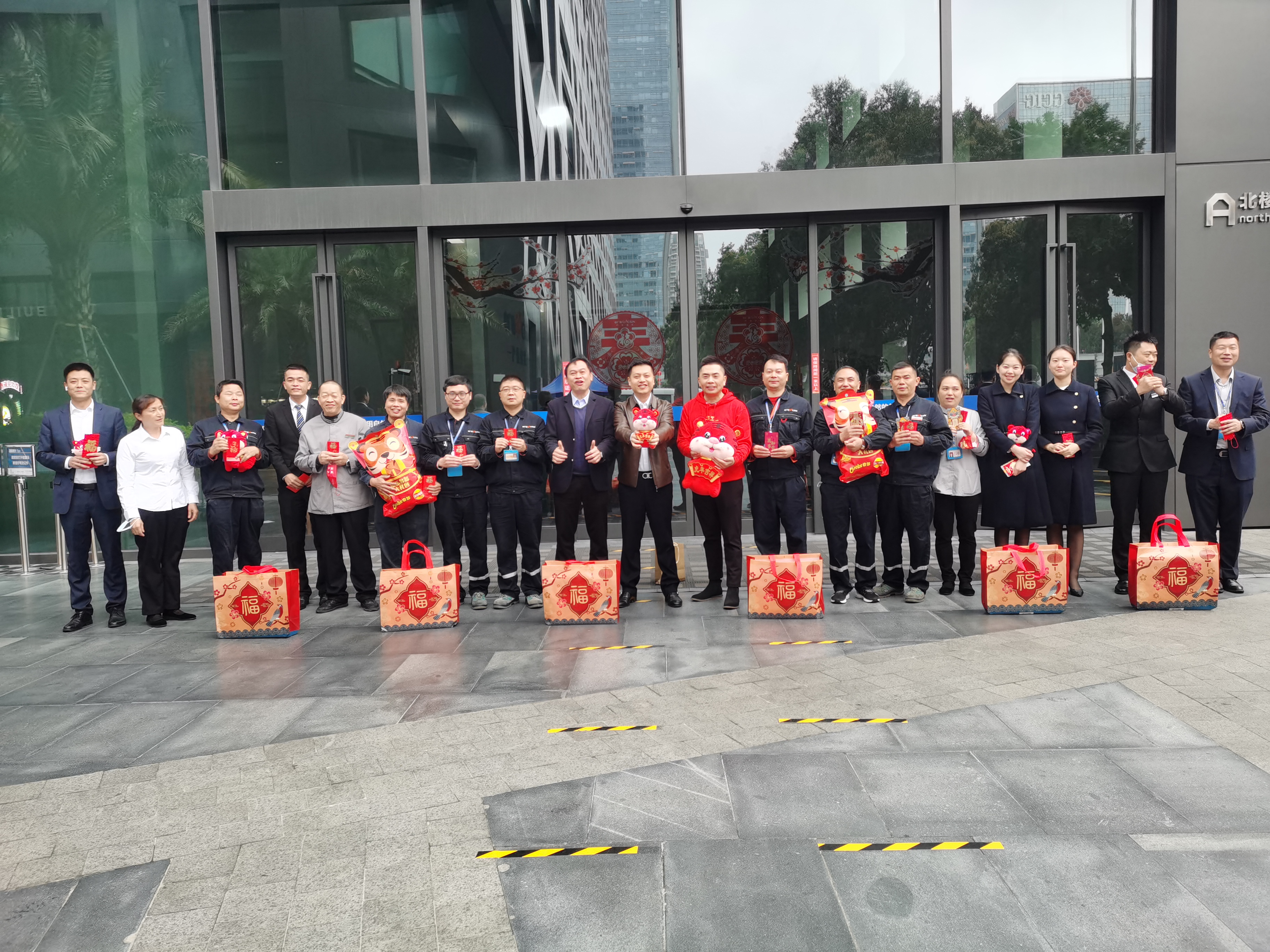 今天一大早,中廣核服副總經理于金魁帶隊看望慰問深圳中廣核大廈、科技大廈、核電大廈及各小區物業管理處春節期間仍堅守在工作崗位的一線員工,向大家道一聲辛苦,送一份祝福。