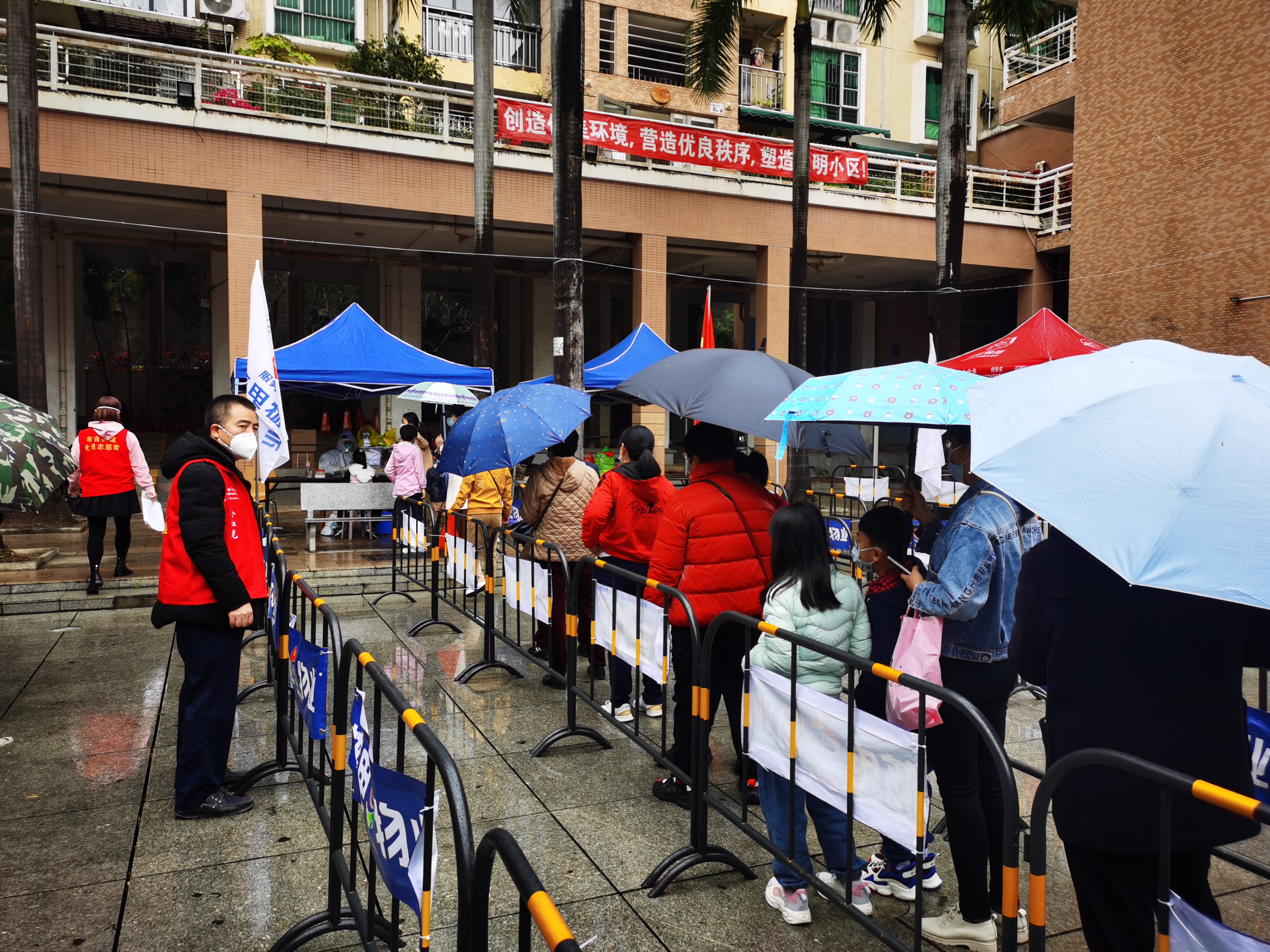 217日上午8點左右,中廣核服所屬物業公司信義假日管理處接到龍崗區布吉街道羅崗社區工作站的緊急通知,要求上午10點前在信義假日名城博雅園廣場開展春節后的首次大規模核酸檢測工作。收到通知后,管理處迅速行動,物業管家、保安員、機電員們齊上陣,擰成“一股繩”,迎著風雨馬上行動起來,布置核酸檢測現場、安排現場秩序維護人員、協調核酸檢測信息錄入員……